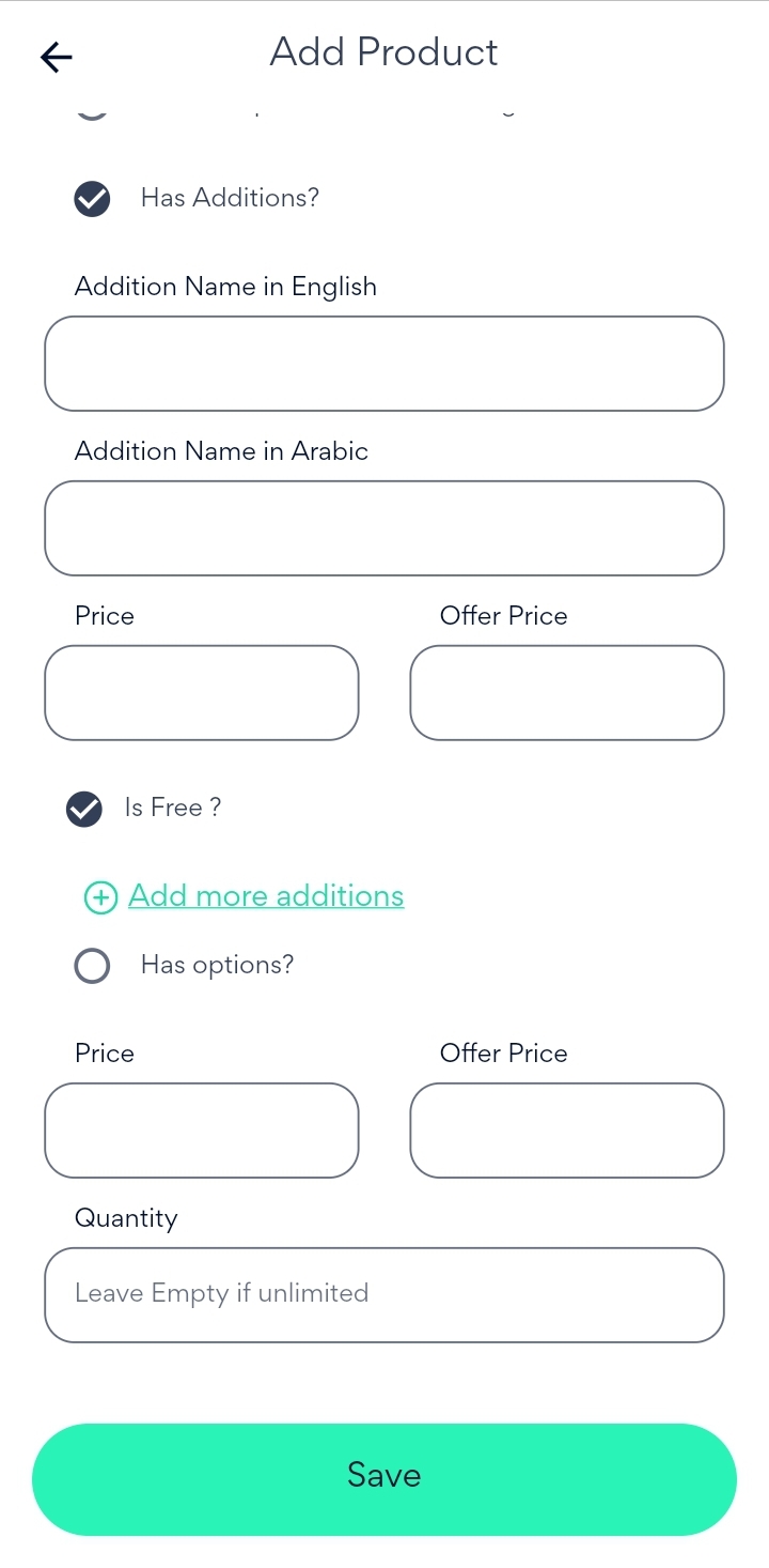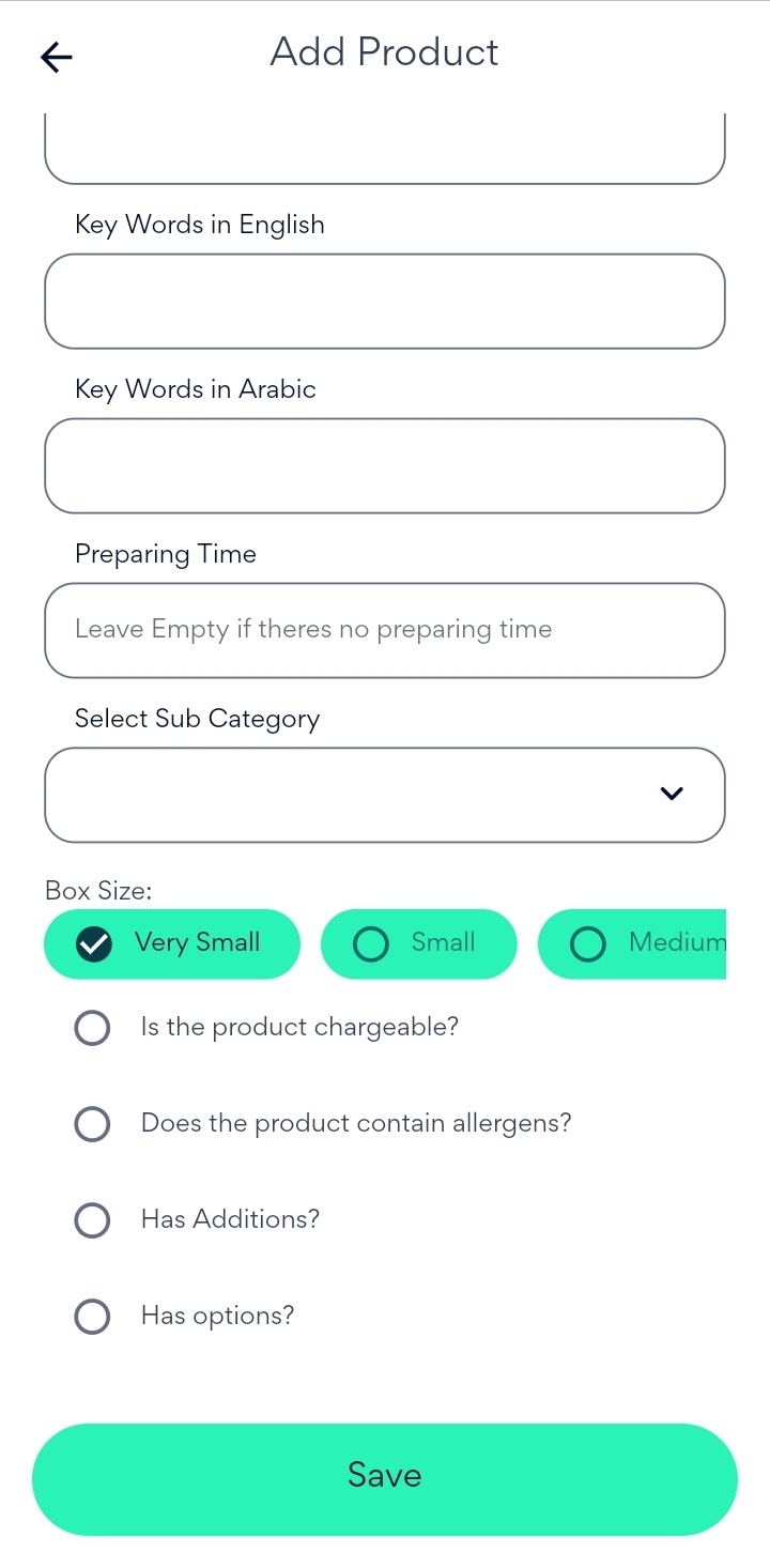 Next, enter the preparing time (if exist), Size of the box, the options and additions of the product (if exist) and their prices.