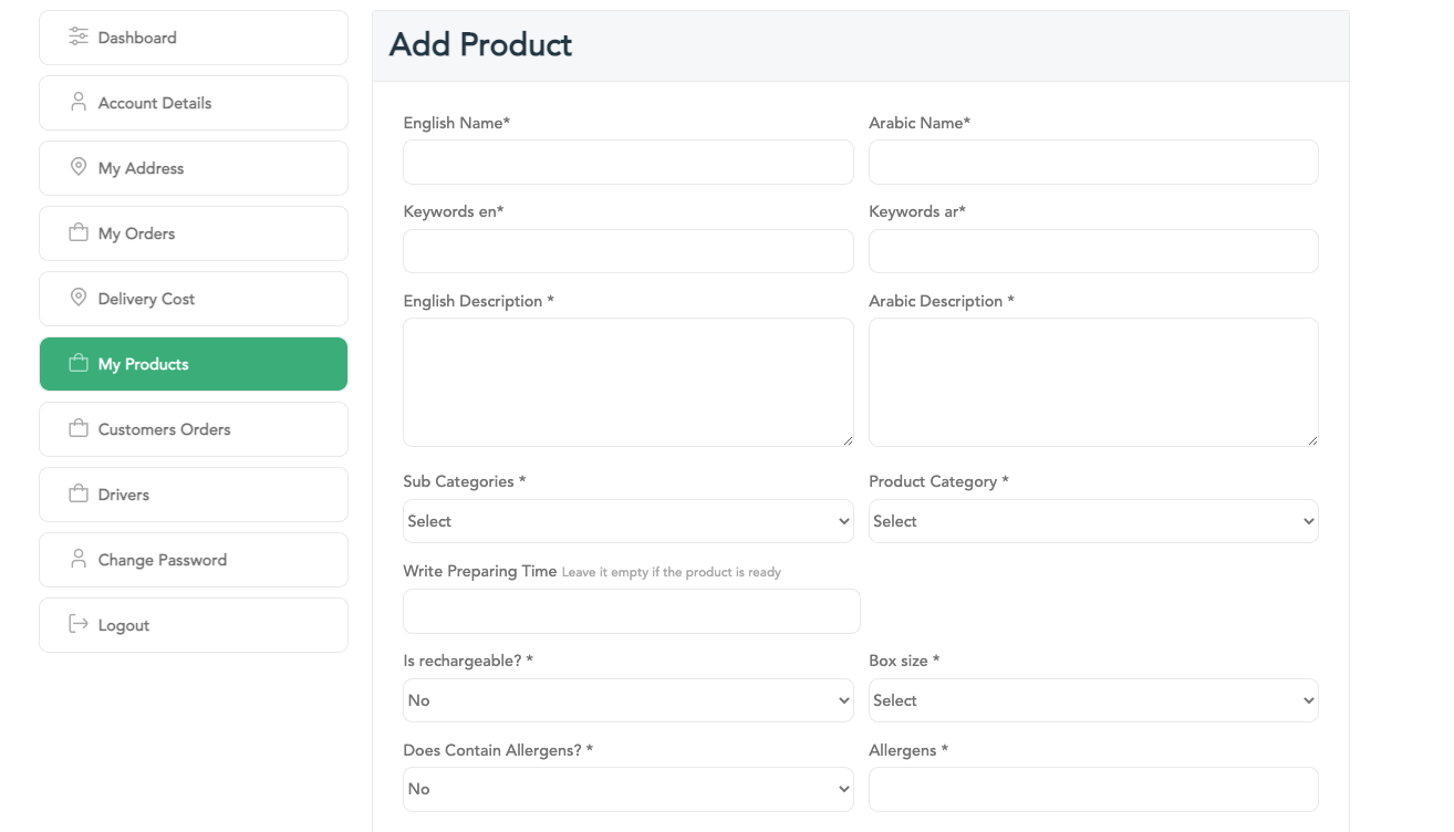Now, it is required to fill the information of the product such as Name (Arabic & English), Category, Description (Arabic & English) and attach photo for the product.